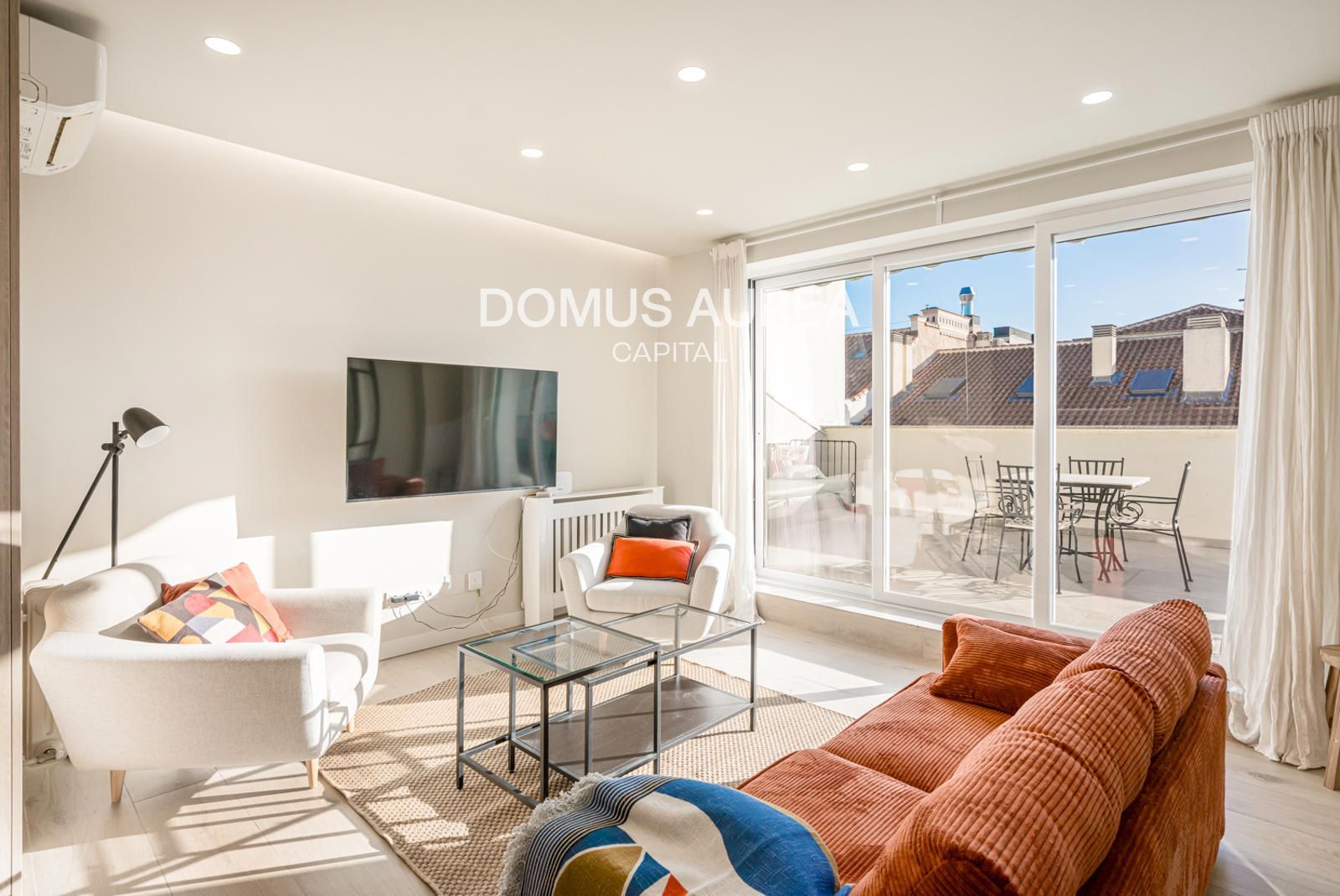 Superficie: 80m²+ 90m² terraza. Nada más entrar nos encontramos con un salón diáfano que dispone de dos grandes puertas correderas acristaladas, que dan acceso a una parte de la espectacular terraza que rodea la vivienda. La terraza, en forma de «U» rodea tres lados de la vivienda, aportando una gran cantidad de luz y unas espectaculares vistas aéreas de la ciudad. Las diferentes zonas de la terraza disponen de gran mesa para comer con pérgola, zonas relax con tumbonas, butacas y sofás y una zona de ducha al exterior para refrescarse los días más calurosos. Toda ella ajardinada con plantas y árboles para ampliar su belleza y confort. La cocina, abierta al salón, está completamente equipada con todos los electrodomésticos y dispone de barra corrida estilo «show cooking». El dormitorio, completamente exterior y con vestidor dispone de acceso directo también a la terraza. El apartamento tiene un baño completo en suite y un aseo de cortesía.