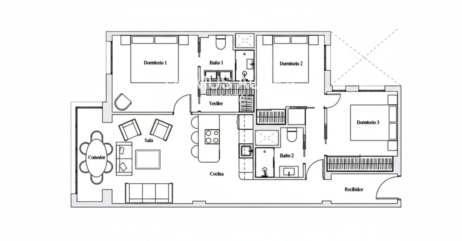 El salón-comedor, con un gran ventanal mirador, ofrece gran amplitud junto con la cocina integrada, con una península que hace las veces de comedor diario. El dormitorio principal cuenta con un baño en suite y un vestidor, brindando un toque de lujo y comodidad. Además, hay dos dormitorios adicionales que comparten un cuarto de baño, todos equipados con armarios empotrados de suelo a techo, forrados y vestidos, ofreciendo un amplio espacio de almacenamiento.