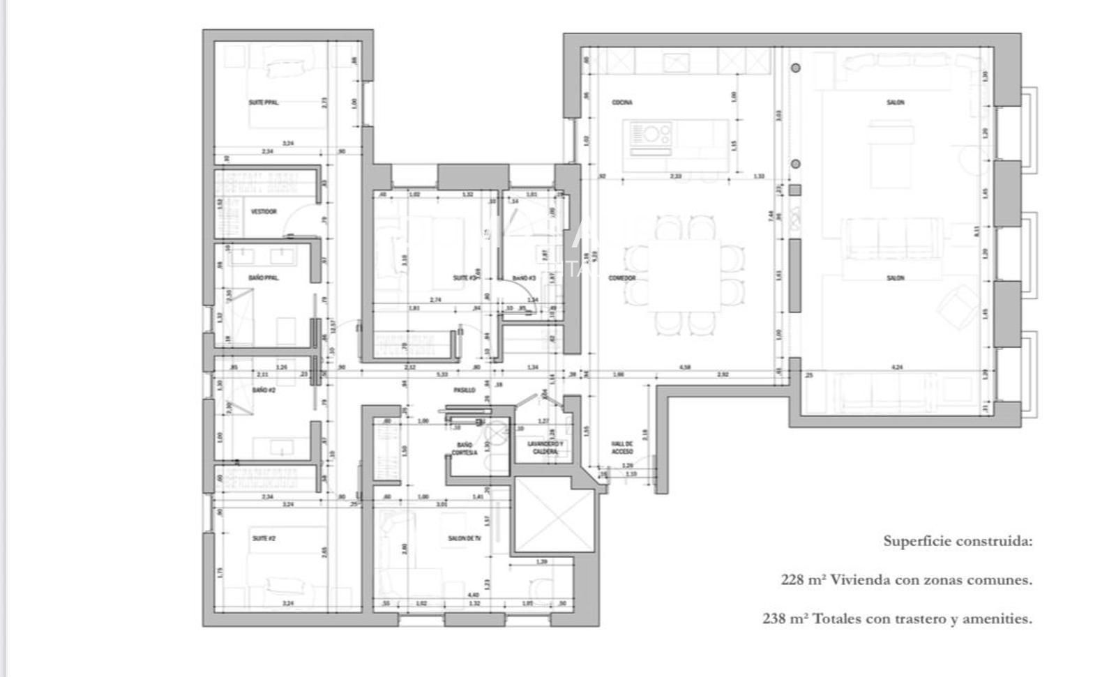 La propiedad de 238 m2, se encuentra actualmente en proceso de reforma. Se sitúa en una luminosa tercera planta exterior de un edificio clásico en proceso de rehabilitación integral de fachada y zonas comunes. Cuenta con tres habitaciones con baño en suite y un aseo de cortesía, un amplio salón comedor con tres huecos a la calle que proporciona mucha luz a la zona social y una cocina semi abierta completamente equipada con electrométricos de alta gama. Así mismo la vivienda cuenta con lavadero y TV room y multitud de capacidad de almacenaje.