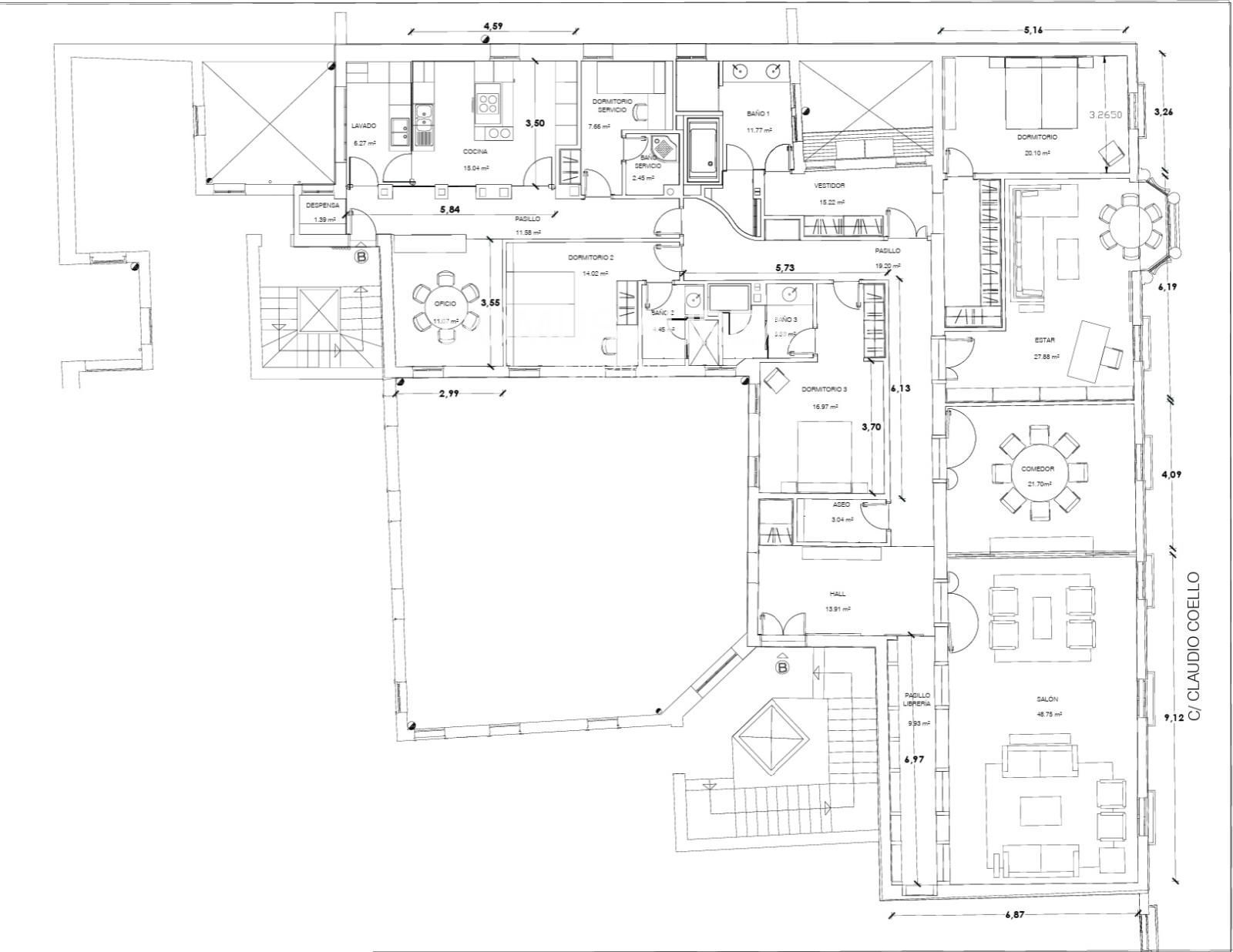 La vivienda cuenta con 393 m² construidos, actualmente distribuidos en una amplia zona social articulada en varios ambientes, con cuatro balcones a la calle, y una zona de descanso compuesta por cuatro dormitorios en suite, dos de ellos también exteriores. Dispone además de una generosa área de cocina con dormitorio de servicio completo. La reforma actual se realizó hace aproximadamente diez años y se está trabajando en una nueva propuesta de distribución más optimizada, que permitirá potenciar aún más la luz, las vistas y la representatividad de la zona social.