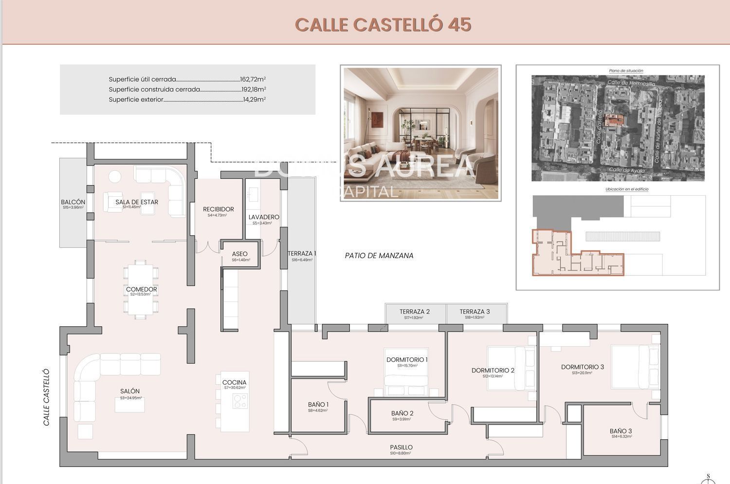 Amplia vivienda de 220 m² ubicada en una finca clásica, fue objeto de una reforma integral hace aproximadamente 15 años, destacando por sus generosos espacios y excelente distribución. Actualmente cuenta con un amplio recibidor, salón-comedor exterior, sala de estar con puertas correderas, cocina independiente con amplia galería y aseo de cortesía. En la zona de noche, tres dormitorios, dos de ellos con baño en suite, y un tercer baño completo, que dan a un amplio patio de manzana con vistas al Hotel Mandarin, lo que proporciona gran luminosidad, ventilación natural y un ambiente especialmente tranquilo, alejando el ruido de la calle.